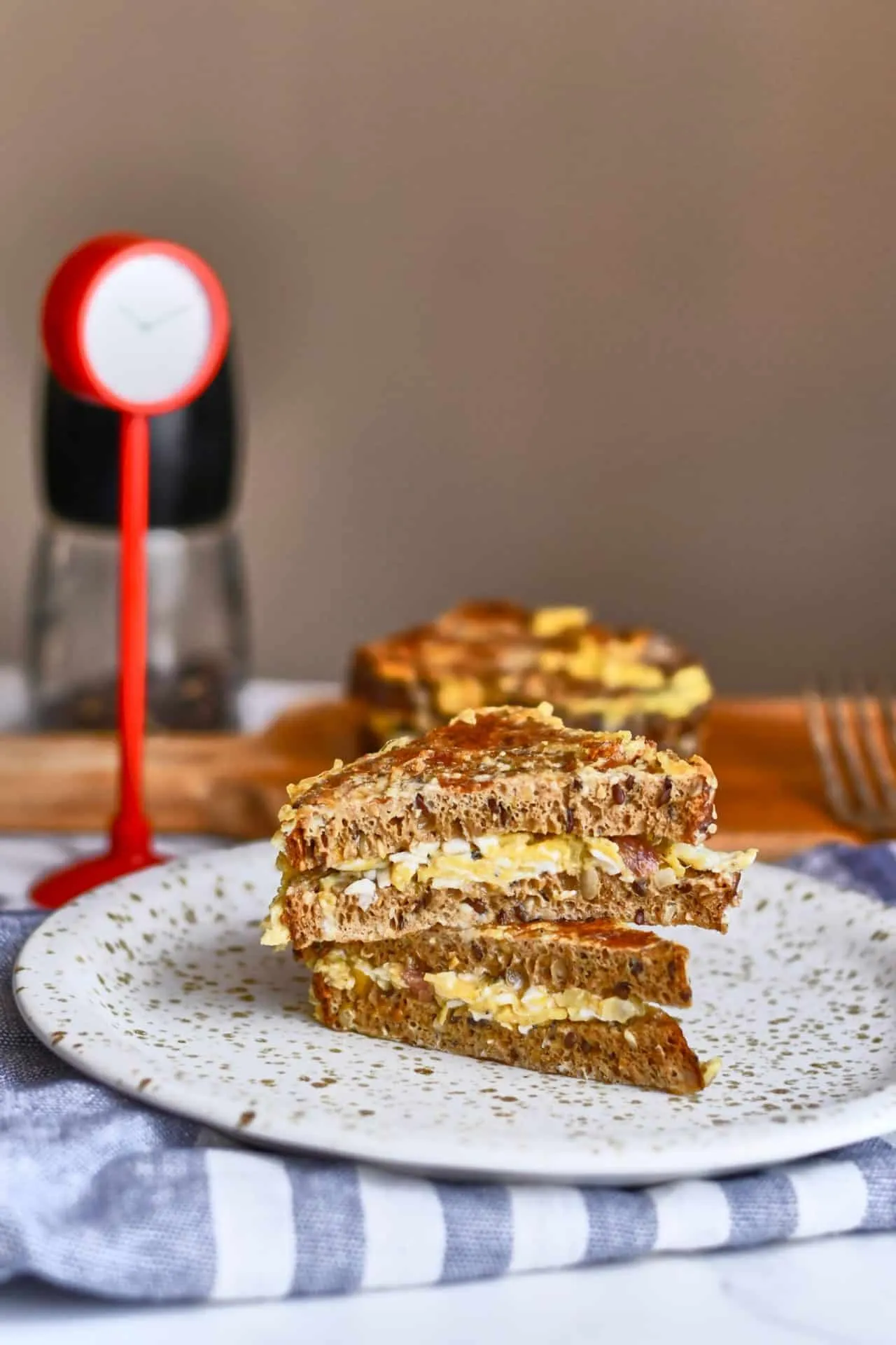 A rántottához az olajon kissé megsütjük a kisebb darabokra vágott kolbászt (ha sok zsír kisülne, öntsünk le belőle), majd rárakjuk az apróra vágott hagymát, amit üvegesre pirítunk. Sózzuk, borsozzuk, mehet rá a pirospaprika, majd a tojások. Elkészítjük a rántottát, amit 1-1 szelet kenyérre halmozunk. Megvárjuk, amíg kicsit kihűl, majd beborítjuk a másik két szelet kenyérrel, így két szendvicset kapunk.