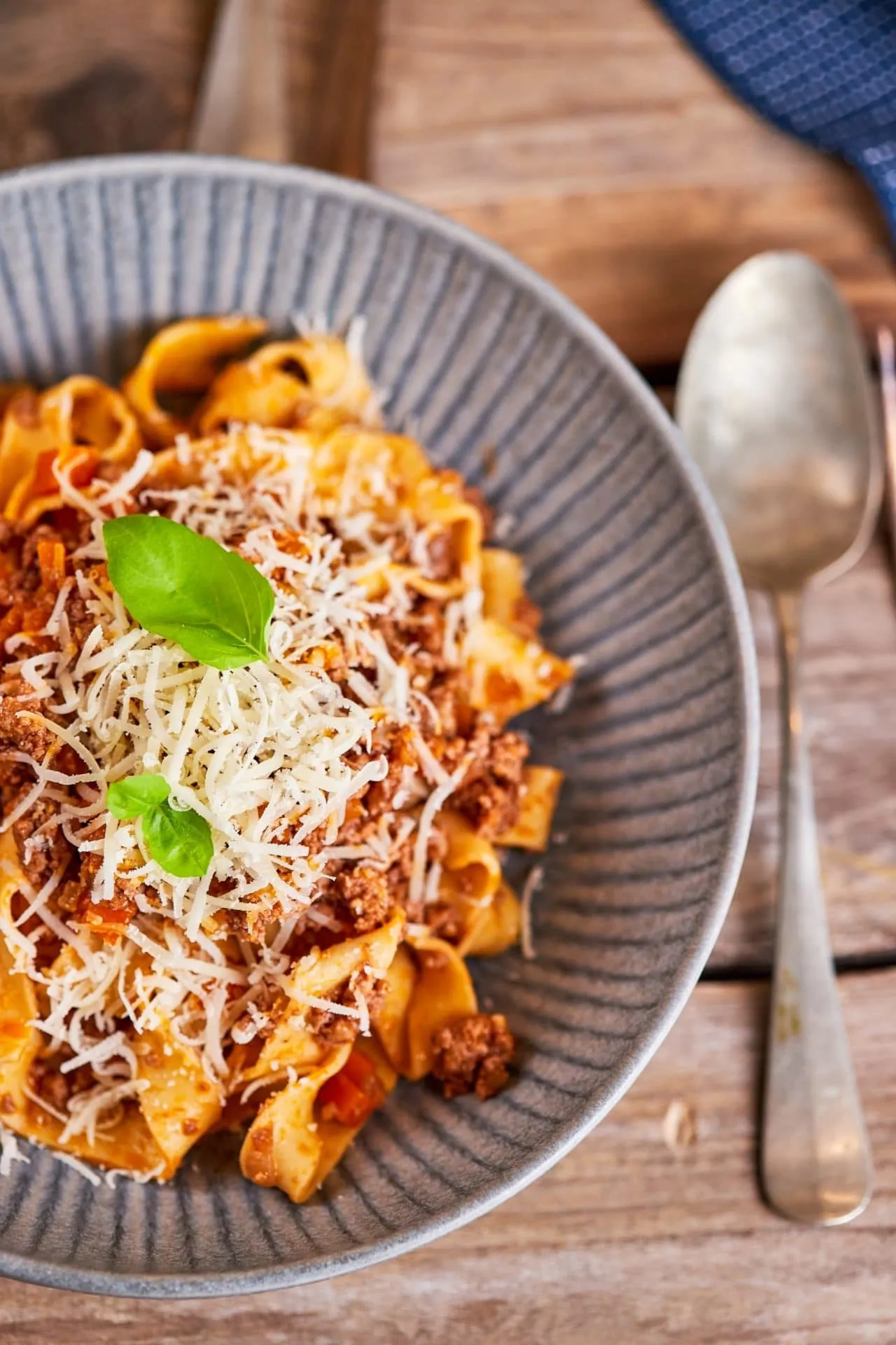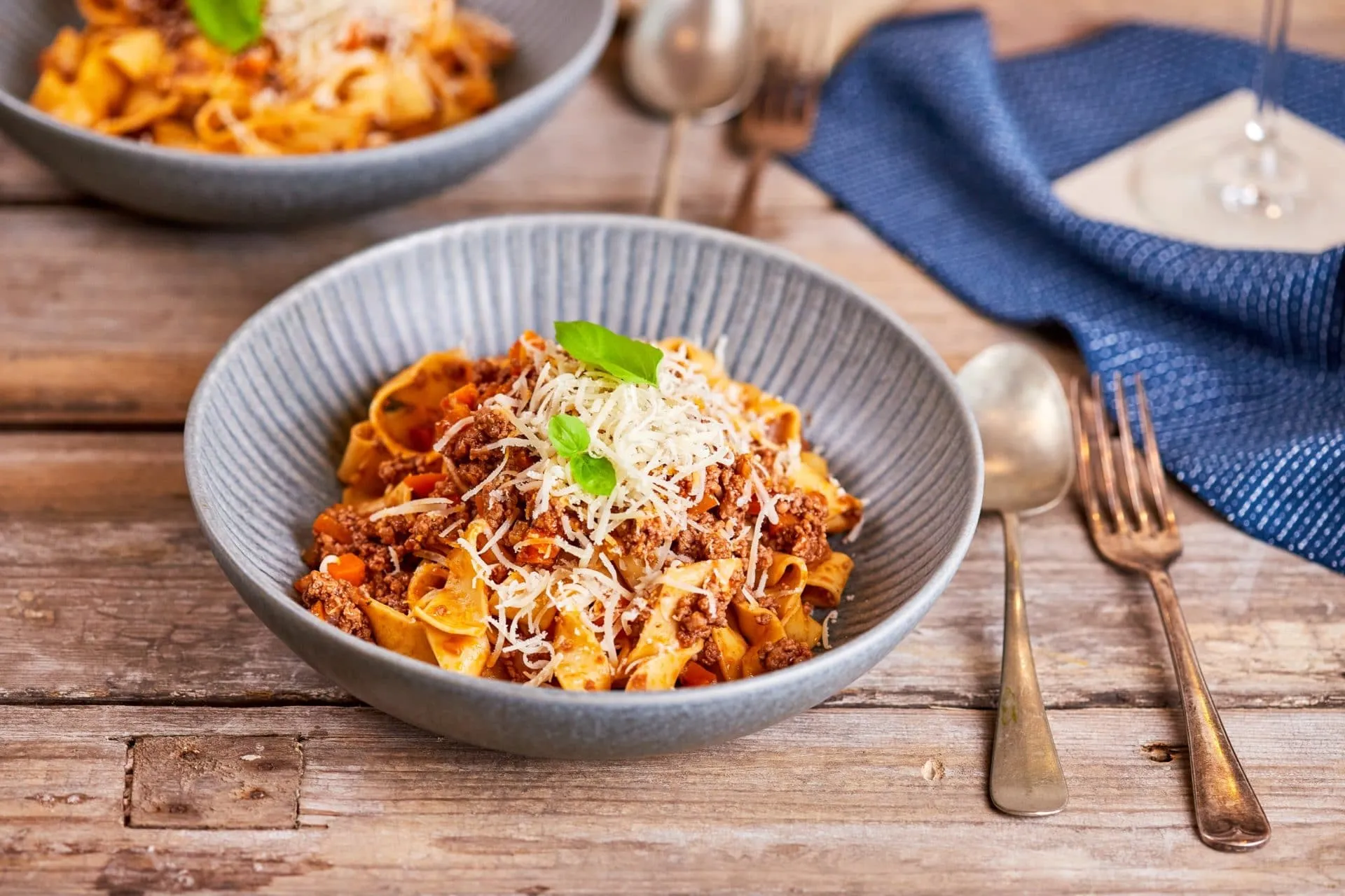 Egy serpenyőben alaposan lepirítjuk az apróra vágott hagymát, a lereszelt zellert és sárgarépát az olívaolajon. Ezt a triót hívják amúgy a sofritónak. Belenyomjuk a fokhagymát, sózzuk, borsozzuk, és felöntjük a vörösborral. Amikor az nagyjából elpárolgott, rátesszük a beáztatott darált húst, és addig pirítjuk, amíg a nedvesség nagyjából elfő.