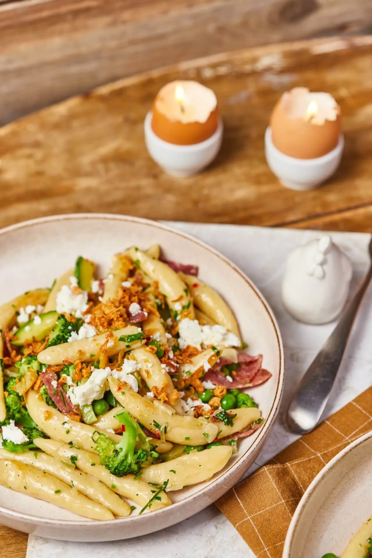 Egy elég nagy tálba öntjük a nudlit, a zöldséges mixet, az aprított petrezselymet és a vajat, majd az egészet összeforgatjuk. Megkóstoljuk, és ha kell, ízesítjük. Tálalásnál rámorzsoljuk a fetát és megszórjuk ropogós hagymával.
