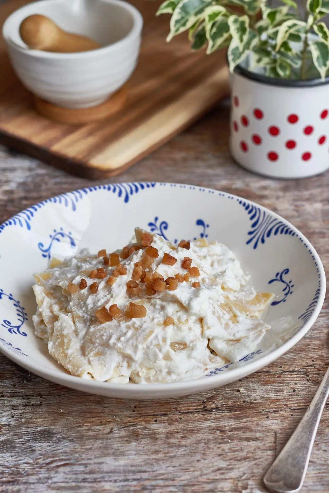A feltéthez a szalonnát kis kockákra vágjuk, zsírjára sütjük, majd félrerakjuk a szalonnát. A zsírt összekeverjük a túróval és a tejföllel, és ha igényli, kevés sóval, majd beleforgatjuk a tésztát. Tálaláskor megszórjuk a szalonnával.