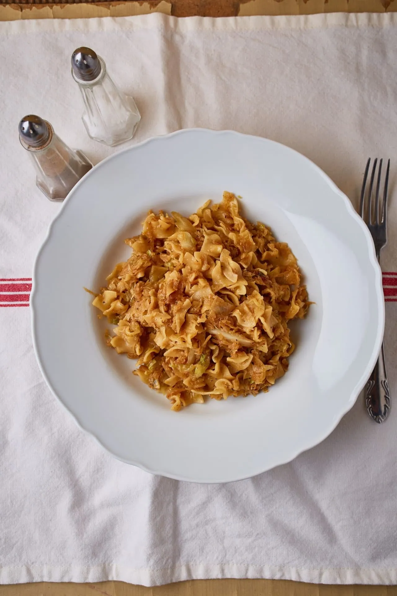 A tésztát sós vízben al dentére főzzük, leszűrjük, és a káposztához keverjük.