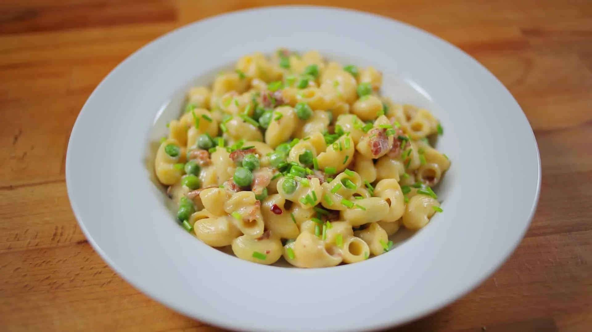 A lefőtt tésztát hozzáadjuk a mártáshoz és alaposan összeforgatjuk. Végül hozzáadunk 2 maréknyi, 5 perc alatt készre főzött, fagyasztott zöldborsót is. A tetejére még szórunk egy kevés parmezán sajtot és friss snidlinget.
