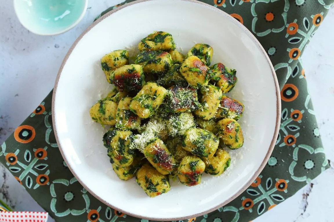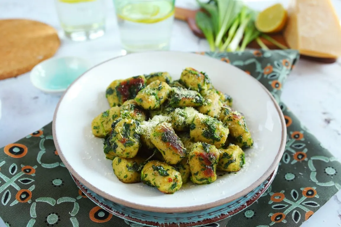 Először a gnocchi-t készítjük el, amihez kezdésként egy száraz serpenyőben lepirítjuk a tökmagot, majd az egészet lezúzzuk egy aprítógépben. A burgonyákat berakjuk a mikróba és a maximális fokozaton kb. 10 percig mikrózzuk, félidőben pedig megfordítjuk. Ennyi idő alatt gyönyörűen megpuhulnak a burgonyák. Egy kanál segítségével kiszedjük a krumplik belsejét, majd krumplinyomón áttörjük és kiterítjük egy nagyobb vágódeszkára.Hozzászórjuk az aprított tökmagot és a lisztet, a tojások sárgáját pedig eloszlatjuk rajta. Fűszerezzük a sóval, borssal és a szerecsendióval, majd egy habkártya segítségével összegyúrjuk annyira, hogy egy lazább kelt tésztához hasonló állagot kapjunk, ügyelve arra, hogy ne dolgozzuk túl. A tésztát lisztezett deszkán henger alakúra formázzuk, majd a habkártyával vagy egy késsel  kb. 2 cm-es darabokra vágjuk. Egy villa segítségével mintákat formázunk a felületükre és forró, sós vízbe dobáljuk őket. Mikor feljöttek a víz felszínére, még egy percig főzzük a gnocchi-kat, majd csapvíz alatt leöblítjük és a megadott vajmennyiség felével összeforgatjuk őket. Ahhoz, hogy még szuperebb ízeket kapjunk, szükségünk lesz egy nagyobb serpenyőre amibe beledobáljuk a gnocchi-kat, hozzáadjuk a maradék vajat és elkezdjük lepirítani. Közben a medvehagymák alsó szárrészét levágjuk, egy aprítógépben lezúzzuk és a gnocchik-hoz adjuk. Szórunk rá egy nagy csipet sót, borsot, alaposan összeforgatjuk, hogy mindenhol összekeveredjen a zúzott medvehagymával és már tálalhatjuk is, egy nagy adag parmezánnal megszórva.