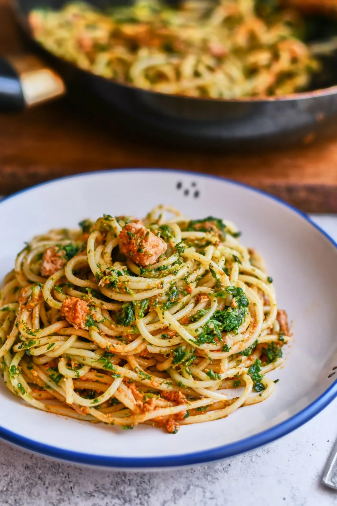 Egy serpenyőben felmelegítjük az olívaolajat, majd üvegesre pirítjuk rajta a hagymát és a fokhagymát. Hozzáadjuk a spenótot, sózzuk, borsozzuk, átkeverjük, és beleforgatjuk a tésztát. Rárakjuk a vörös pesztót és a tonhalat, keverünk rajta egyet, és már ehetjük is!