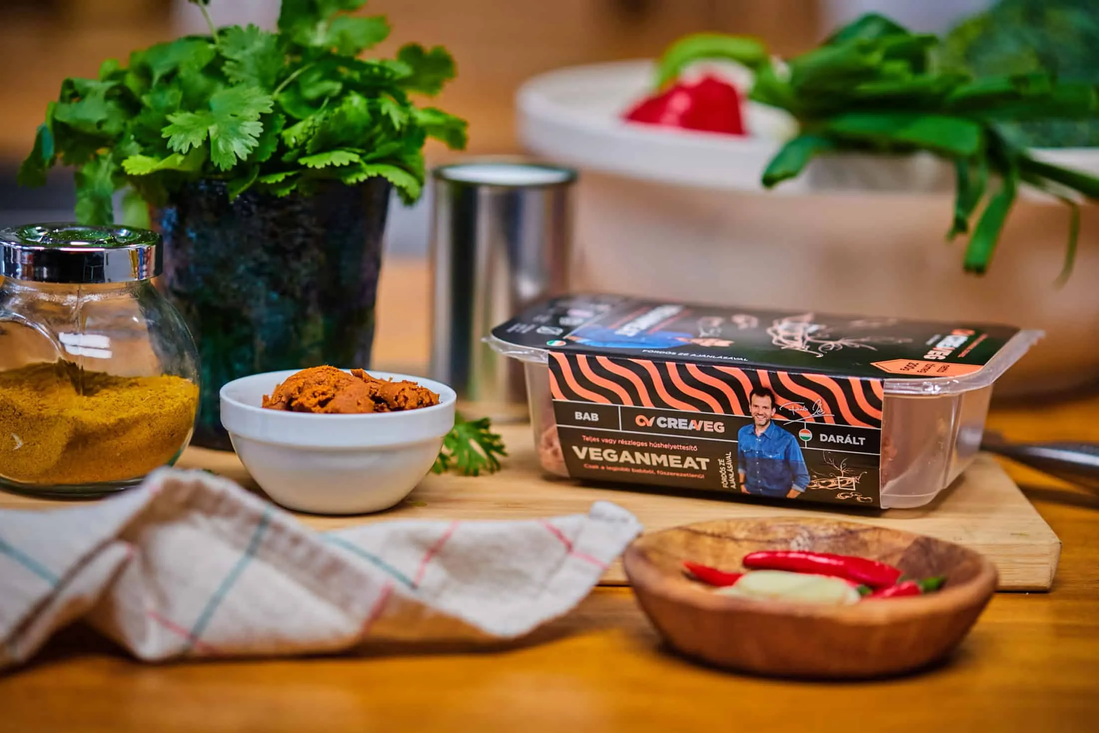 A currys vegagolyók elkészítéséhez a darált húspótlót összegyúrjuk a curryporral, sózzuk, borsozzuk, és diónyi gombócokat formázunk belőle.