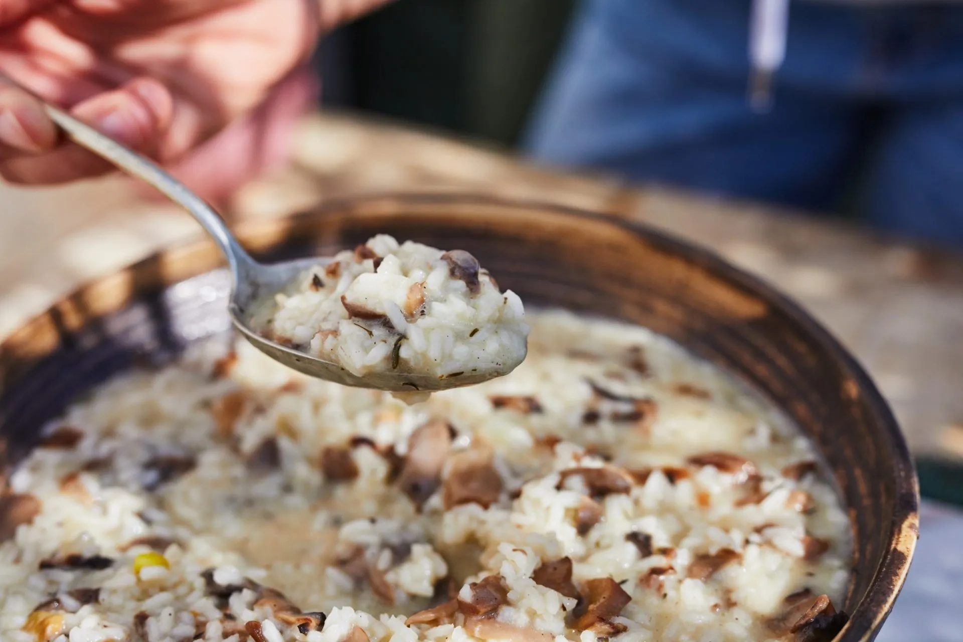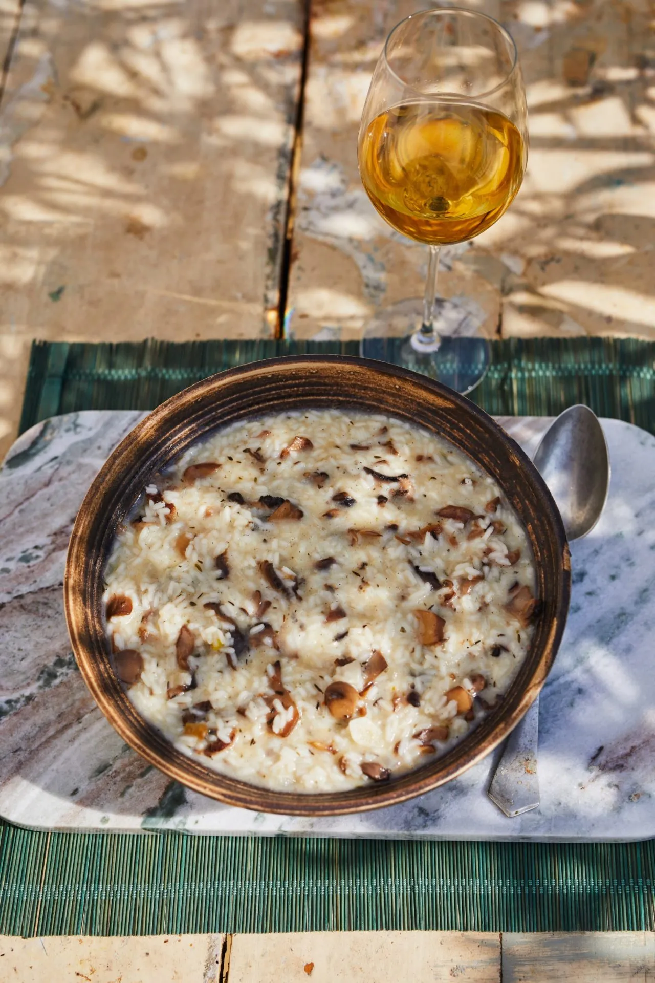 Az olajon magas hőmérsékleten lepirítjuk a gombát a kakukkfűvel, majd kiszedjük. Ugyanabban a serpenyőben üvegesre pároljuk az apróra vágott hagymát és fokhagymát, sózzuk, borsozzuk, rárakjuk a rizst, elkeverjük, és felöntjük a borral. Ezután, mintha rizottót csinálnánk, folyamatosan adjuk hozzá az alaplevet. Annyi a különbség, hogy ez a fajta rizs több alaplevet vesz fel. Amikor összeállt, belerakjuk a vajat, a sajtot, sózzuk, borsozzuk, és hagyjuk pár percet állni tálalás előtt.