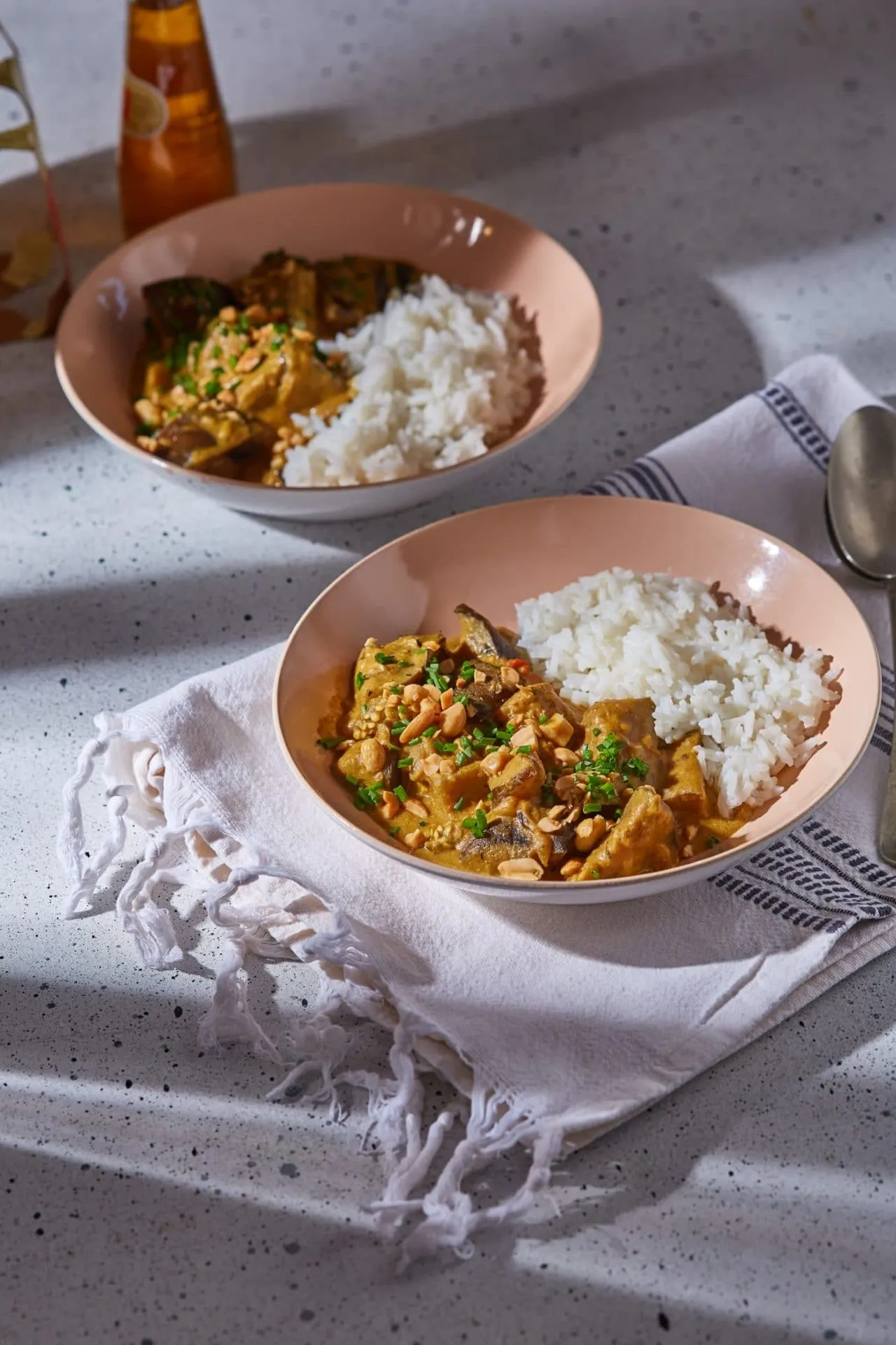 Füstölésig hevítünk egy serpenyőt, és megpirítjuk benne a nagy darabokra vágott padlizsánt, majd kiszedjük. Az olajon megpirítjuk az apróra vágott hagymát, fokhagymát, chilit és gyömbért. Rászórjuk a curryport, elkeverjük, sózzuk, borsozzuk, felöntjük a kókuszkrémmel, belerakjuk a mogyoróvajat, a padlizsánt, a szójaszószt és a vizet. Felforraljuk, majd 20 percig rotyogtatjuk. A végén meglocsoljuk a lime levével. Apróra vágott snidlinggel, mogyoróval és főtt rizzsel tálaljuk.