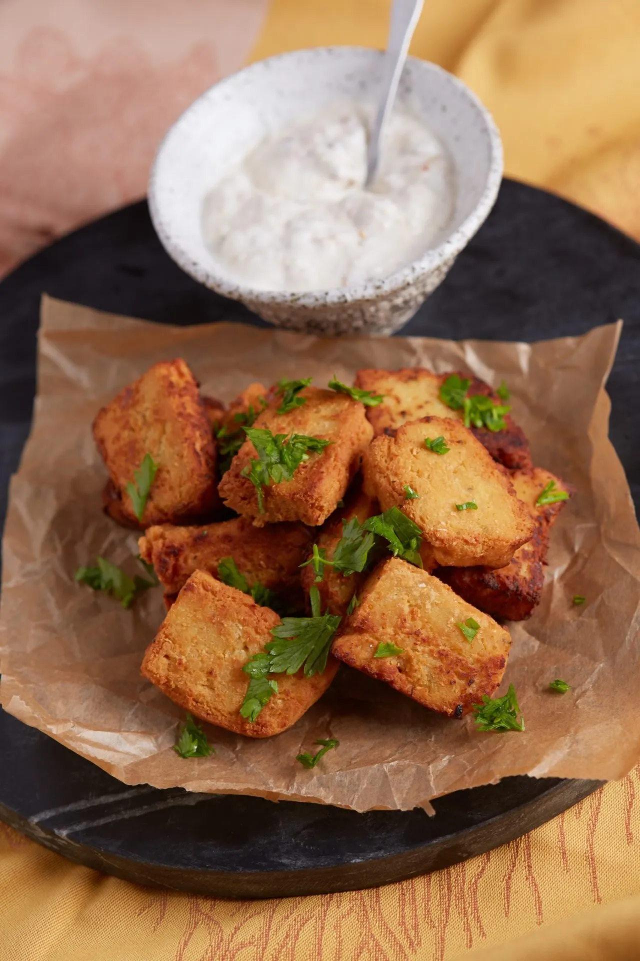 Egy serpenyőben olajat hevítünk, és aranybarnára sütjük benne a felszeletelt darabokat. Ha megsültek, papírtörlőre szedjük, és a mártással tálaljuk.