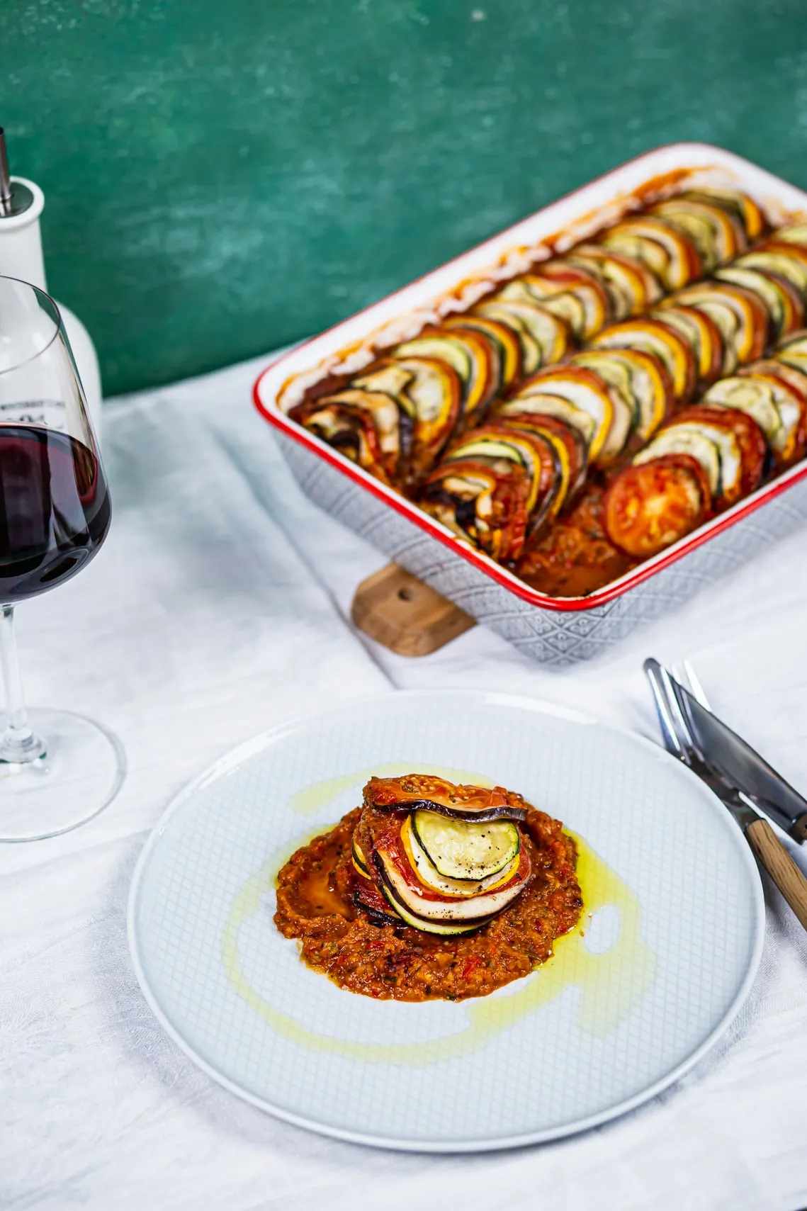 A sorrendbe rakott szeletelt zöldségeket a ratatouille-krémbe állítjuk, sózzuk, borsozzuk, meglocsoljuk egy kevés olívaolajjal, majd 180 fokra előmelegített sütőben kb. 45 perc alatt készre sütjük.