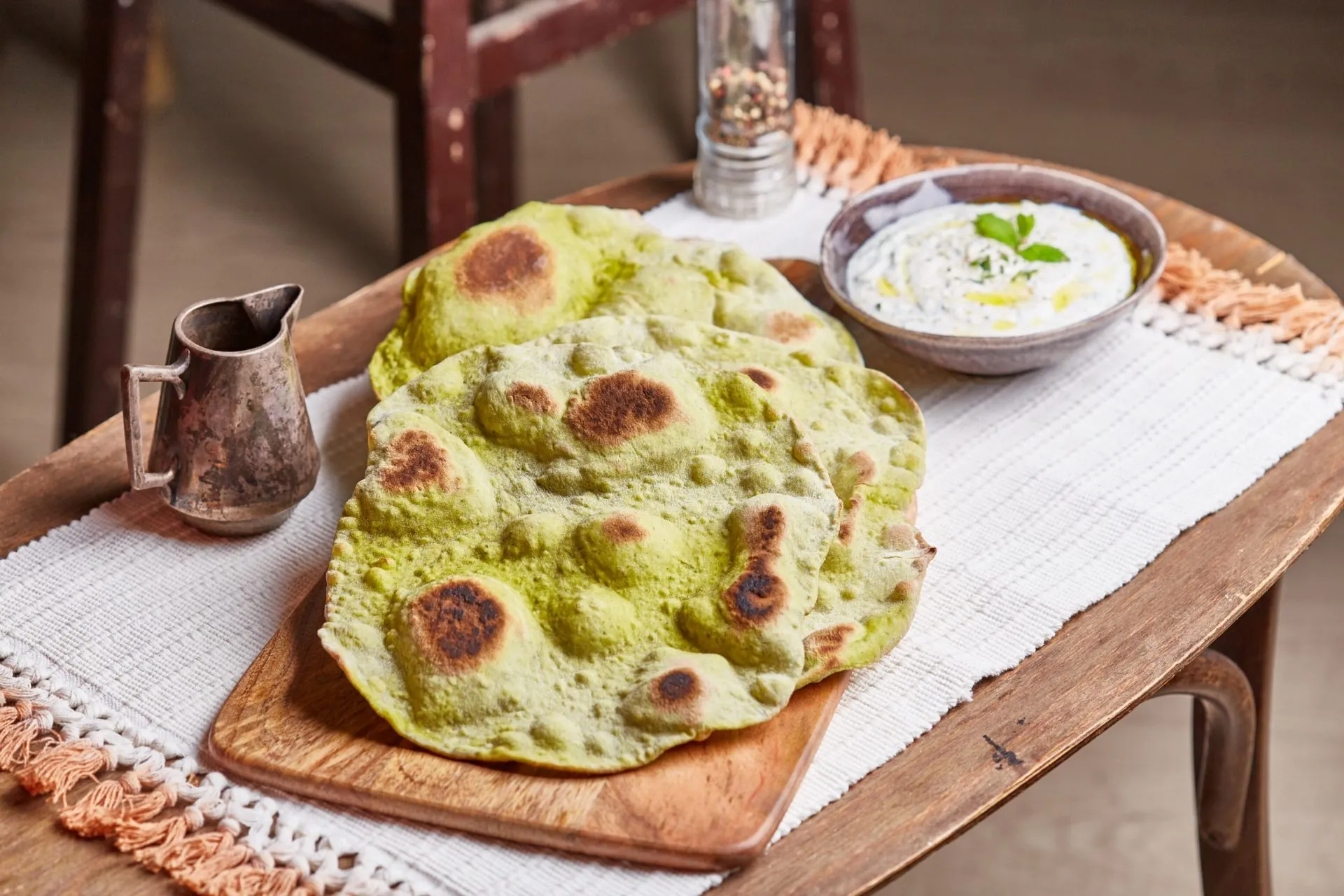A lepényekhez a spenótot, a rozmaringág levélkéit, a bazsalikomot és a petrezselymet egy aprítóba rakjuk, felöntjük kb. 100 ml vízzel, és alaposan lezúzzuk. A maradék vízbe belekeverjük az élesztőt, előveszünk egy nagy tálat, belemérjük a lisztet, az olajat, a joghurtot, a cukrot és a sót, majd beleöntjük az élesztős vizet és a zöld fűszeres keveréket is. Alaposan kidagasztjuk a tésztát, majd letakarjuk, és 40 percig kelesztjük. Újra átgyúrjuk, majd 10 részre osztjuk, lisztezett felületen 1-2 mm-esre nyújtjuk, és egyenként megsütjük őket.