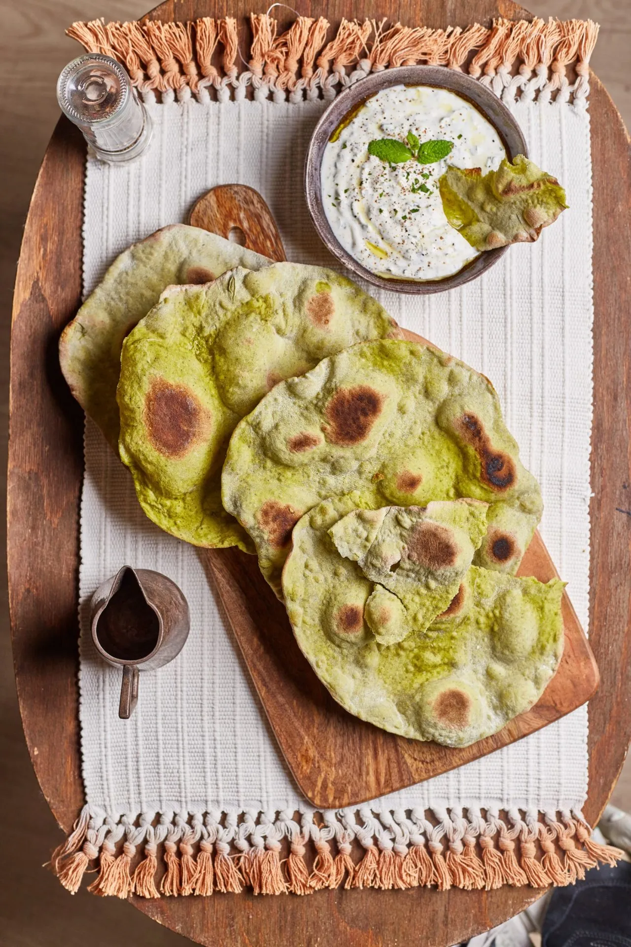 A mártogatóshoz a görög joghurthoz keverjük a citromlevet, a sót, a borsot, a zúzott fokhagymát és az apróra vágott zöld fűszereket, majd ezzel tálaljuk a naan lepényeket. Kevés fűszeres olajjal lekenve is nagyon finom.