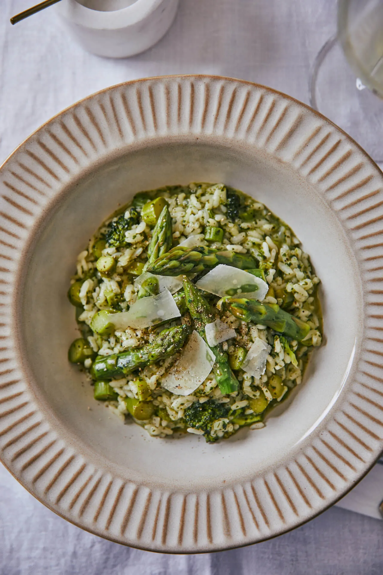 Közben a maradék 1 liter alaplevet vagy vizet felrakjuk melegedni, hozzáöntjük a spenótos alaplevet is, és beledobjuk a brokkolit és a spárgákat (ezeknek ennyi hő elég is, hogy még kissé roppanósak maradjanak a rizottóban).